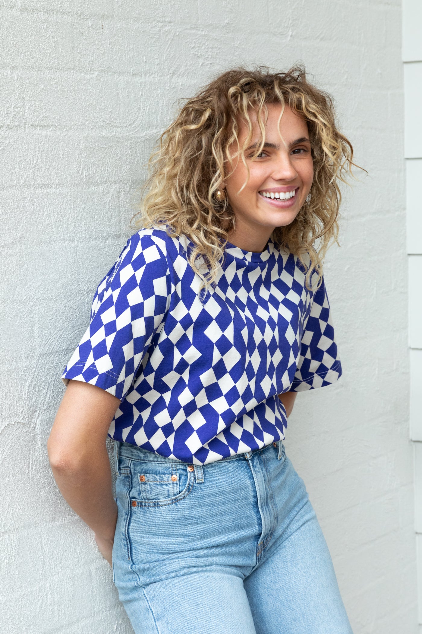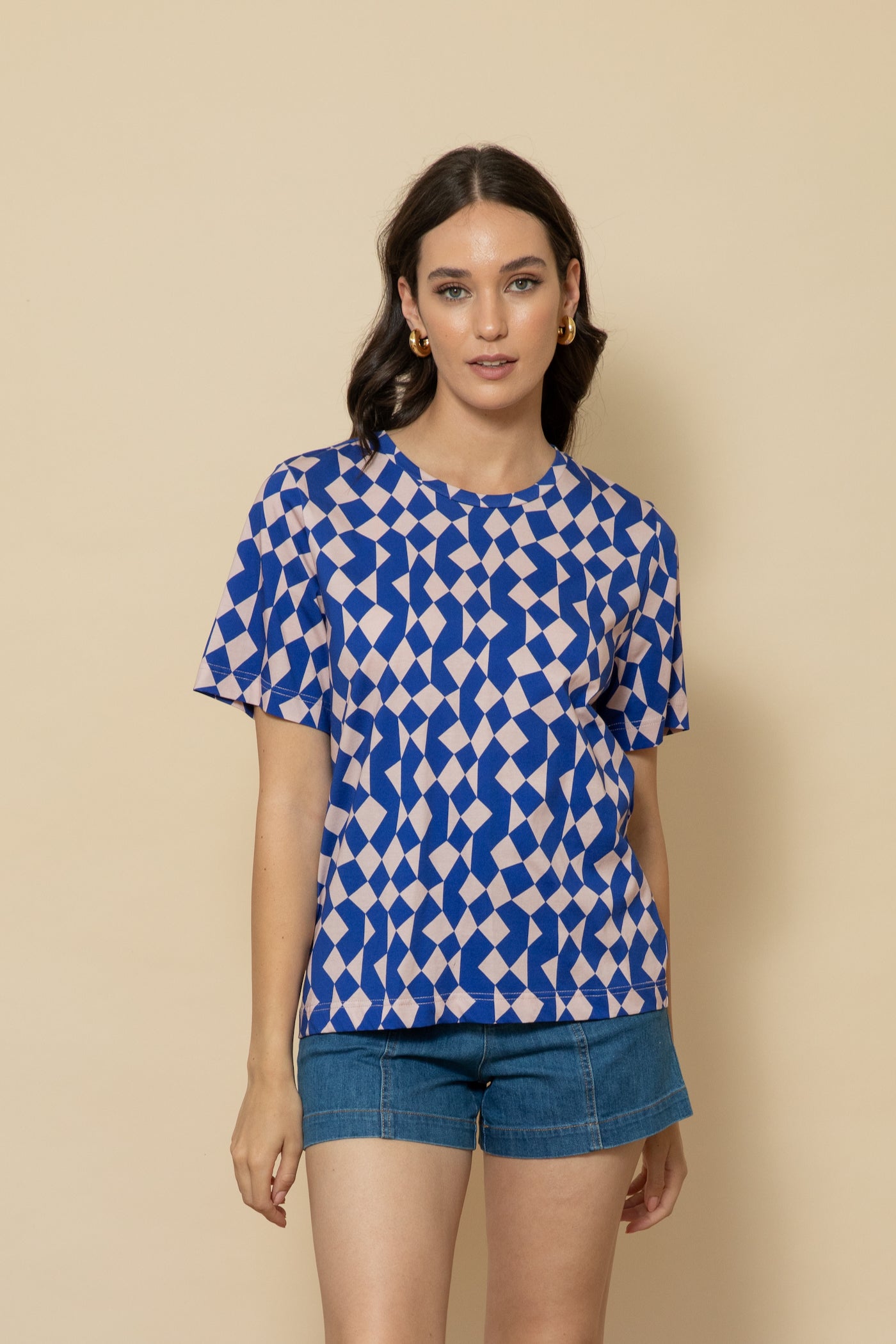 Woman wearing Frock Me Out LABYRINTH Capped Sleeve Tee with denim skirt