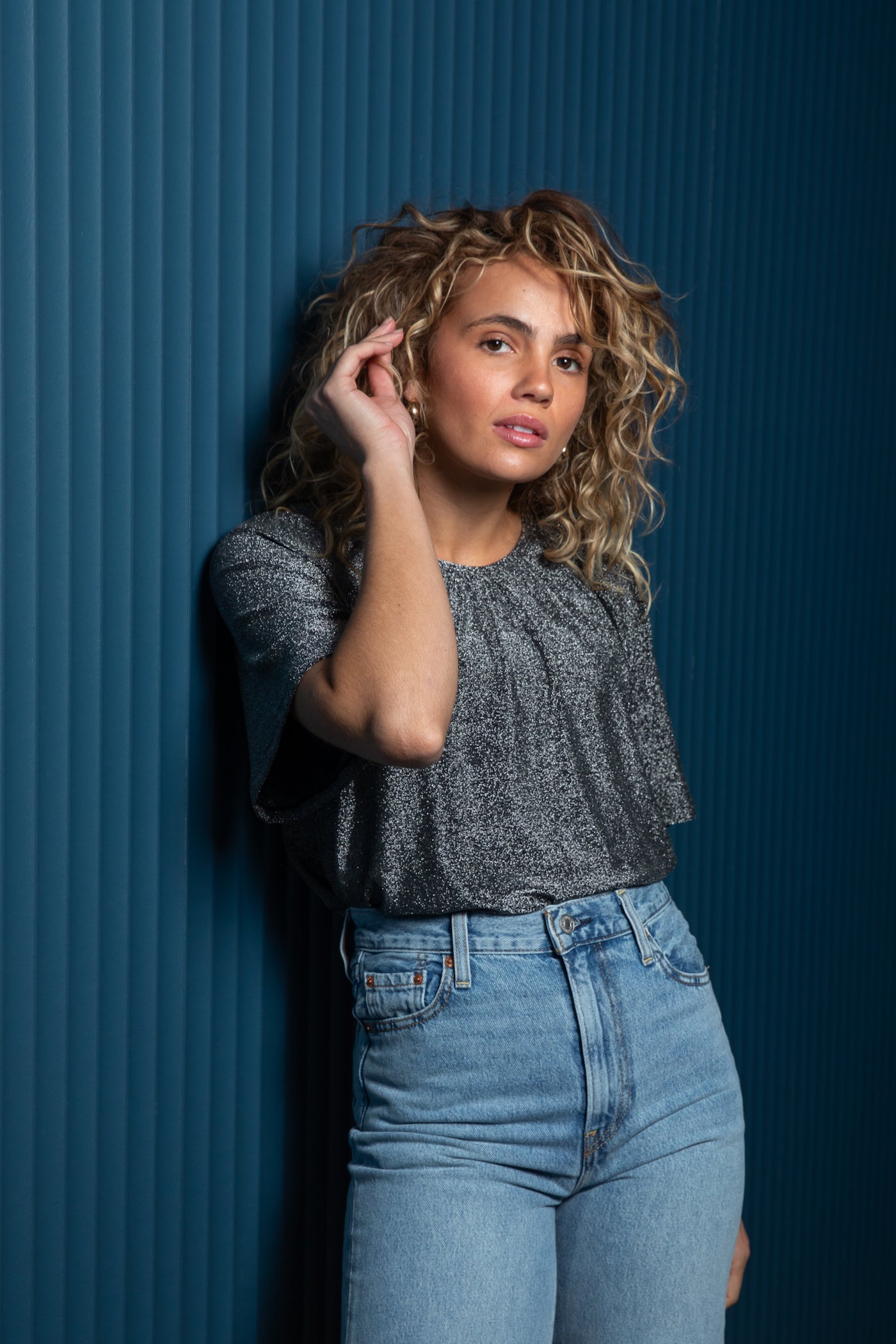Woman in a black outfit with a tan belt standing in front of a glass door.