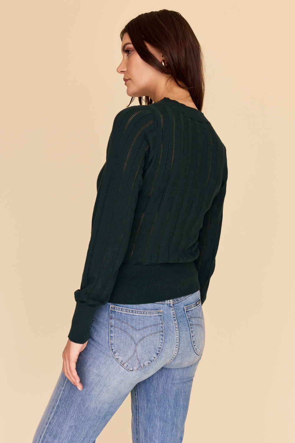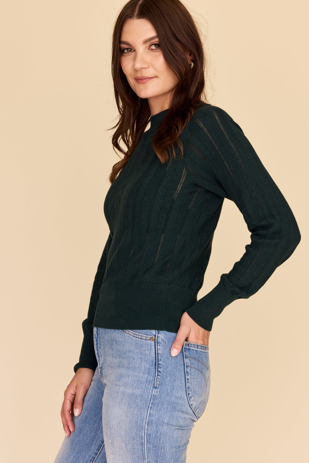 Regular price $127.20Made from the softest cotton and cashmere blend, this knit sweater features a zig zag pointelle knit in the most perfect shade of deep green.