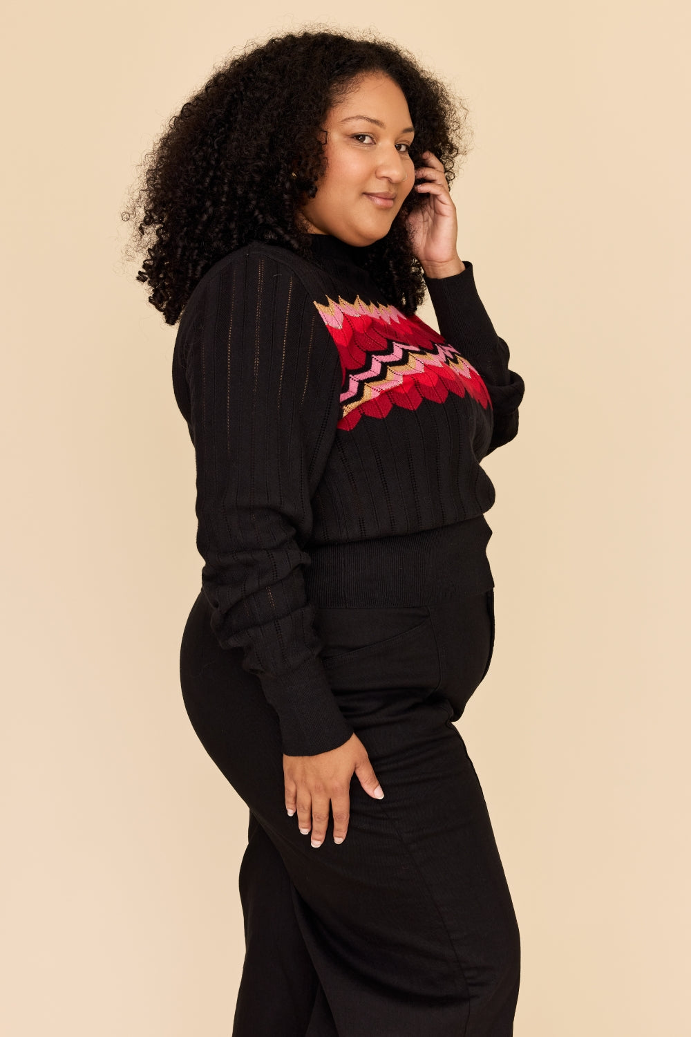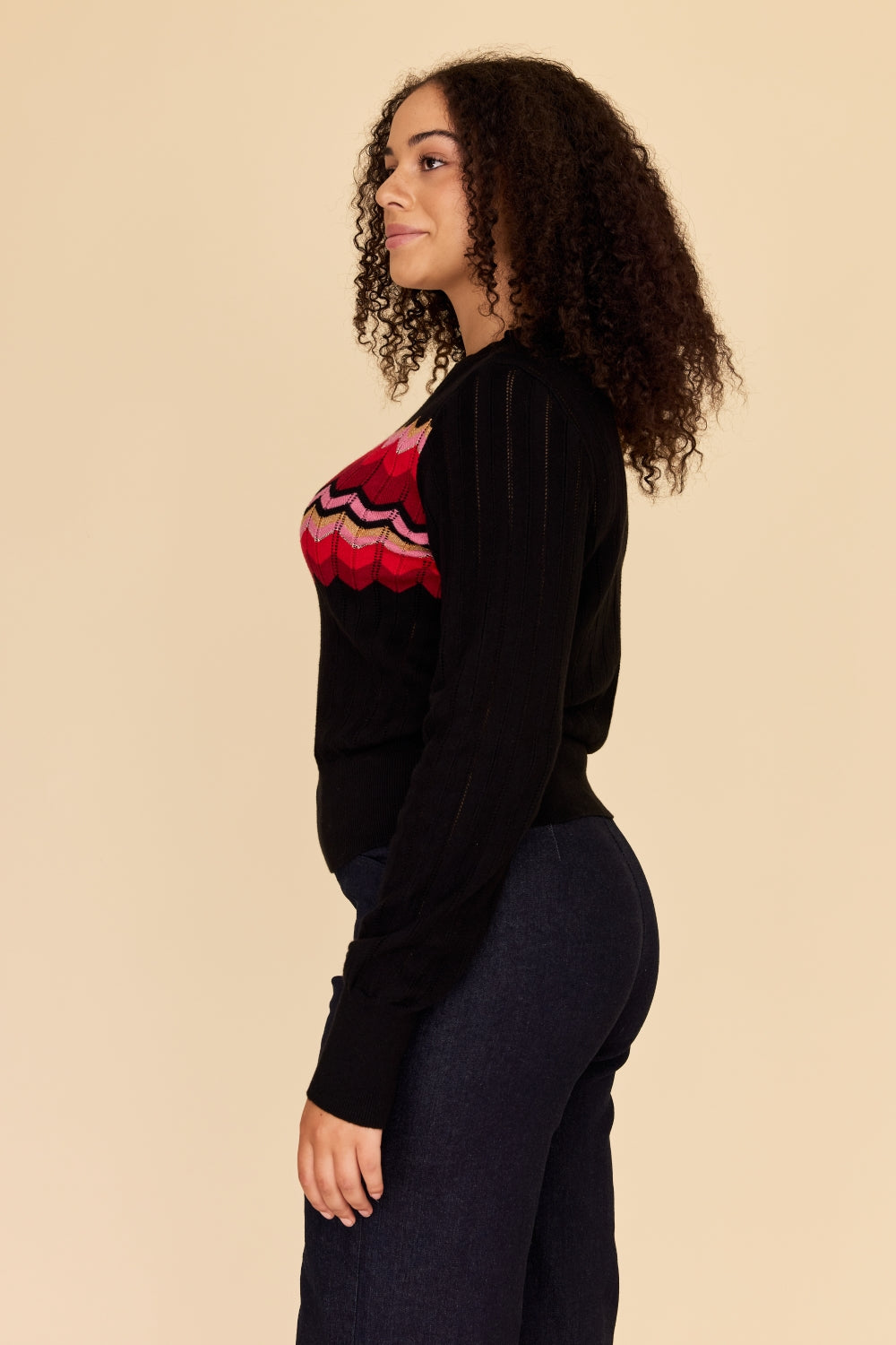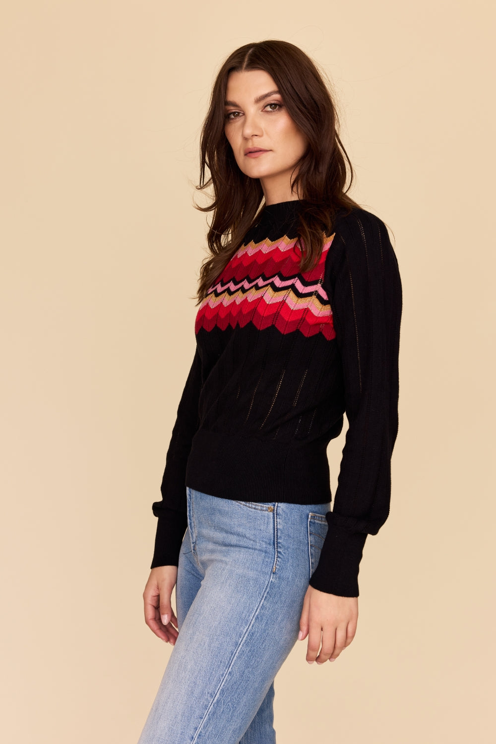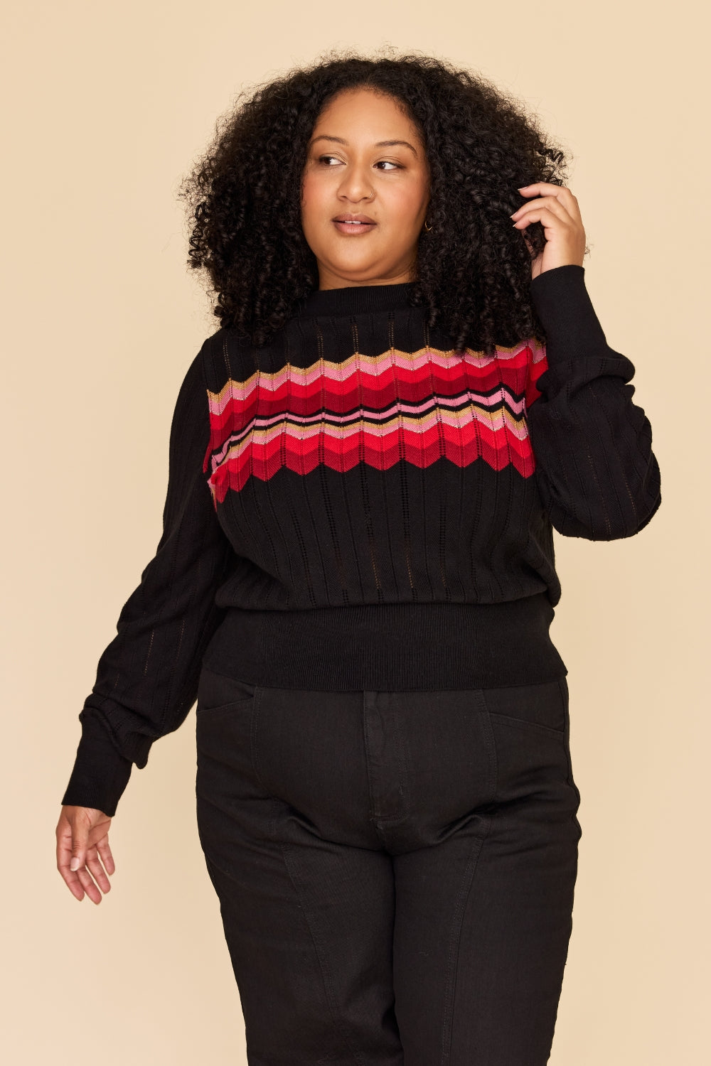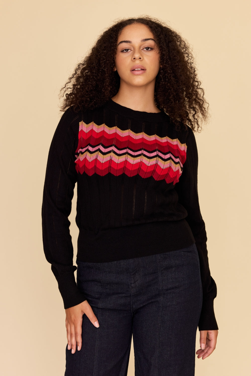 Made from the softest cotton and cashmere blend, this knit sweater features a stunning zig zag stripe in vibrant red, deep burgundy, pink with gold and lurex accents, on a perfect black base in a beautiful pointelle knit.