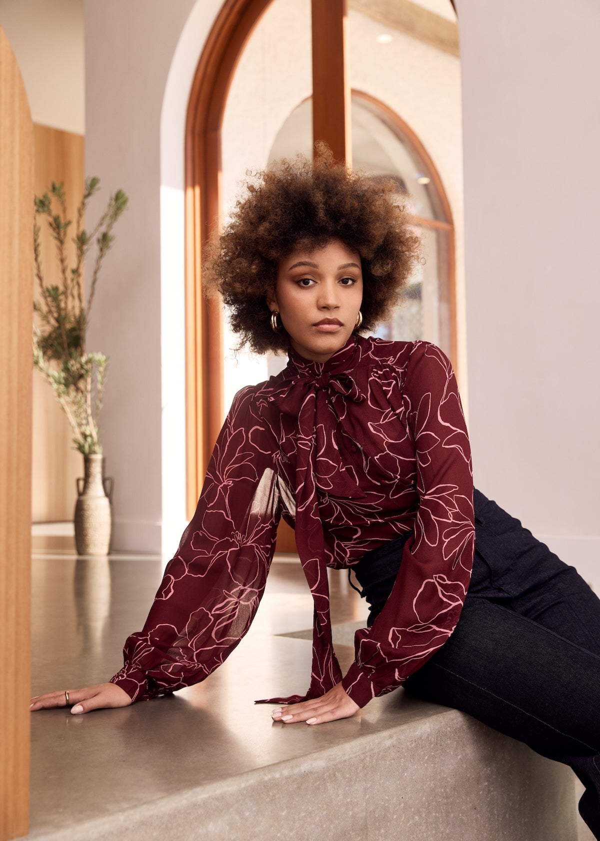 Burgundy with pink outline Magnolia print long sleeve button through blouse with pussy bow tie neck